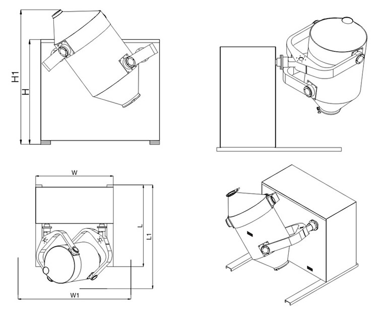 該機工作時,混科器具有三維空間運動,在進行自轉的同時進行公轉,混料器一方面具有強烈的湍動作用,加速了物料的流動和擴散,另一方 面有翻轉和平移運動,克服了離心力的影響,使物料不會產生比重偏析和集聚現象,也無死角,保證混合均勻。