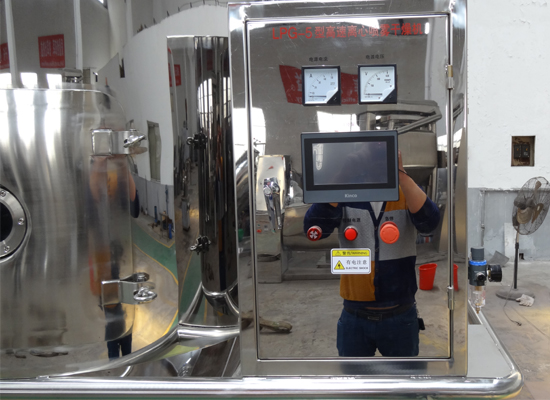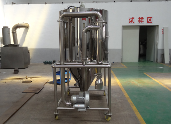 空氣經過濾和加熱,進入干燥器頂部空氣分配器,熱空氣呈螺旋狀均勻地進入干燥室。料液經塔體頂部的高速離心霧化器,(旋轉)噴霧成極細微的霧狀液珠,與熱空氣并流接觸在極短的時間內可干燥為成品。成品連續地由干燥塔底部和旋風分離器中輸出,廢氣由風機排空。
